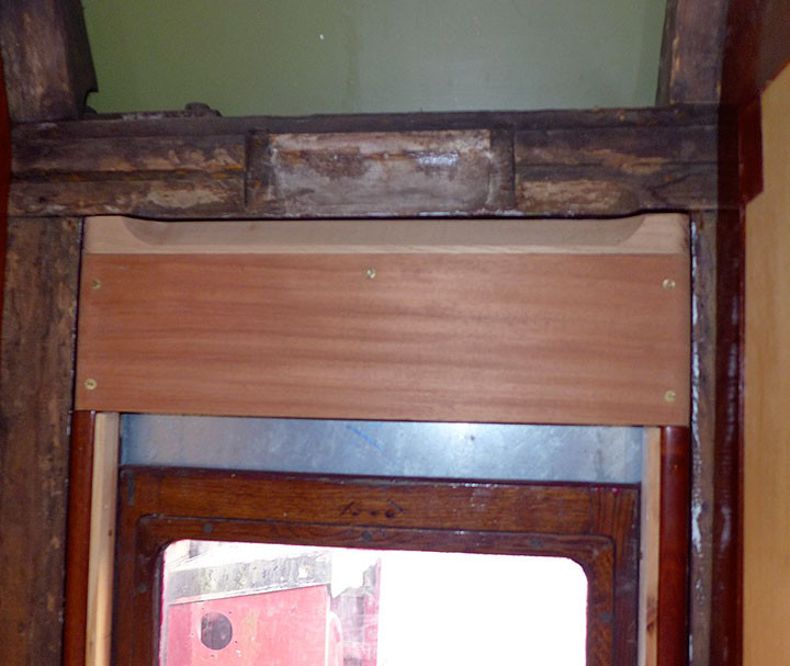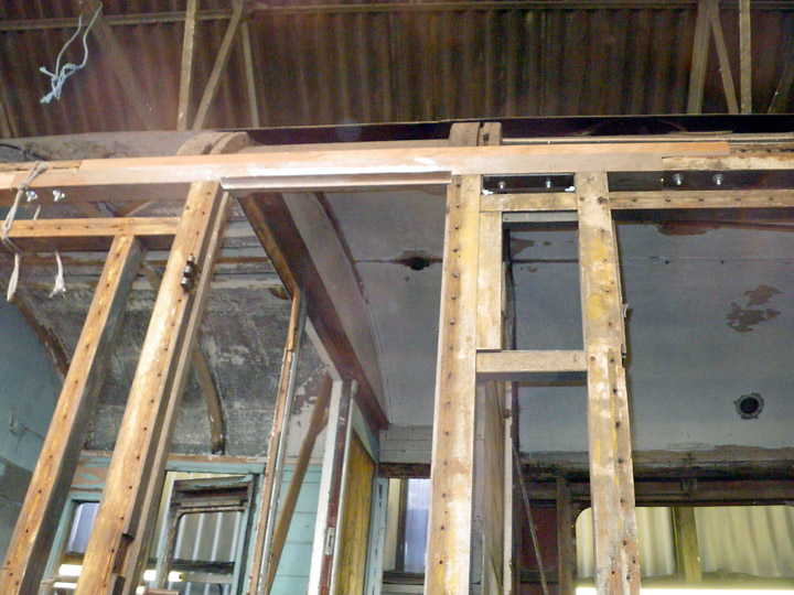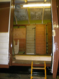 The partition between passenger saloon and vestibule with the rotten sections of tongue & groove boarding removed.