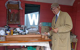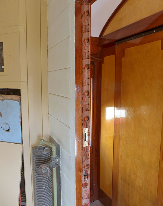 The partition wall between the guard's compartment and luggage van with the original T&G boarding stripped of several layers of paint.