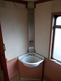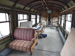 View of guard's compartment showing the stripped down tongue & groove boarding and the partition between the guard's door and where the guard's seat will be reinstated.