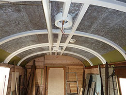 The inside of luggage van showing original T&G boards after stripping. The framing which will contain the sliding door into the guard's compartment can be clearly seen on the partition wall, with the door itself propped up on the left. The whole of the east side needs the T&G panelling replacing.