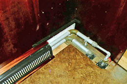 From each external branch the steam was fed up through the floor to an on/off valve. The pipe then ran the length of the saloon wall before returning on itself. The exhaust steam and water was then vented beneath the floor. The passenger’s feet are protected from the hot pipes by grills, one below each window, these being obtained from the LNER Coach Association based on the NYMR. Again clearances were very tight, care having to be taken that the return pipe had sufficient slope for condensed water not to accumulate causing corrosion problems.