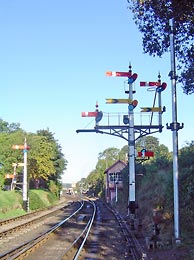 The temporary signal has two 4 foot arms on a single post, the top one reading into the down main and the lower one into the back road. There is a disk at the foot of the post reading into the rock siding. There is no signal provided for moves into the down yard from the Kidderminster line. As the distant arms for Bewdley North are not provided on the temporary signal, the Bewdley South down distant by the tunnel has been disconnected and will remain fixed at caution until the refurbed bracket goes back up.