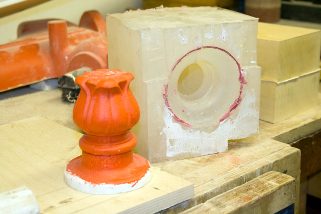 The completed pattern for the adaptor between the half harps and the top of the lamp posts. The method used to produce the floral detail has been featured earlier. This was subsequently attached to the lower portion of the pattern and core print turned from Jelutong. Being a one piece pattern it was necessary to create an odd-side shown underneath the pattern. The hollow underside was produced with a parallel cylindrical corebox.