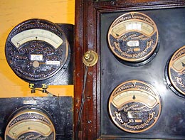 To control the dynamo voltage at just above the nominal 24 volts a regulator is required. This is the large black box that can be seen at the top of picture above. The regulator consists of a collection of coils, wire resistors and switches to achieve the voltage regulation and retain it at a steady level at all speeds above 25 miles per hour. Each carriage is fitted with a regulator. When the dynamo is at rest the voltage required for the lamps is supplied by a bank of lead acid batteries which can just be seen at the rear of the test rig at the bottom right. |