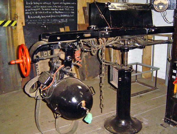 Each carriage has its own dynamo which is belt driven from a pulley on one of the bogie axles. Here the dynamo will be driven in a similar manner by a variable speed motor, mounted beside the rig, controlled by the two red handwheels, operating the mechanism at the base of the test rig.