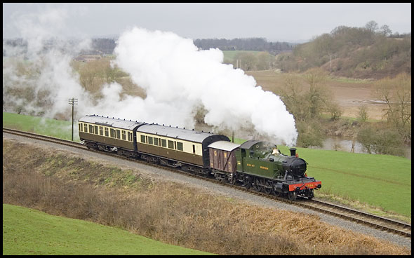 Here are a few images from the latest Hagley Hall photo charter on 23rd February 2007. An excellent day, well organised by the very helpful Hagley Hall team. GWR small prairie 4566 with Fruit Van 2302 and two of the GW(SVR)A carriages, 6913 and 1146, gave a very good representation of typical Great Western branch line train. Photos: Paul Bennett